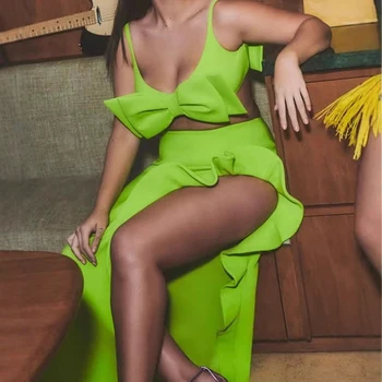 • Bowknot Halter Top Ruffle Slit Skirt Women's Casual 2 Piece Set Fashion