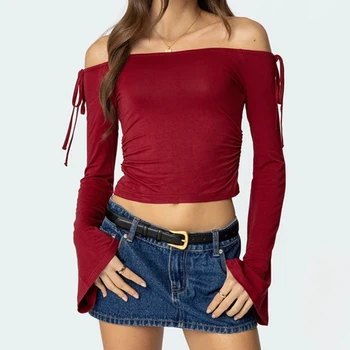 • Drop Shoulder Bow Tie Shrunken Pleated Short Neckless Women's Tops T-Shirt